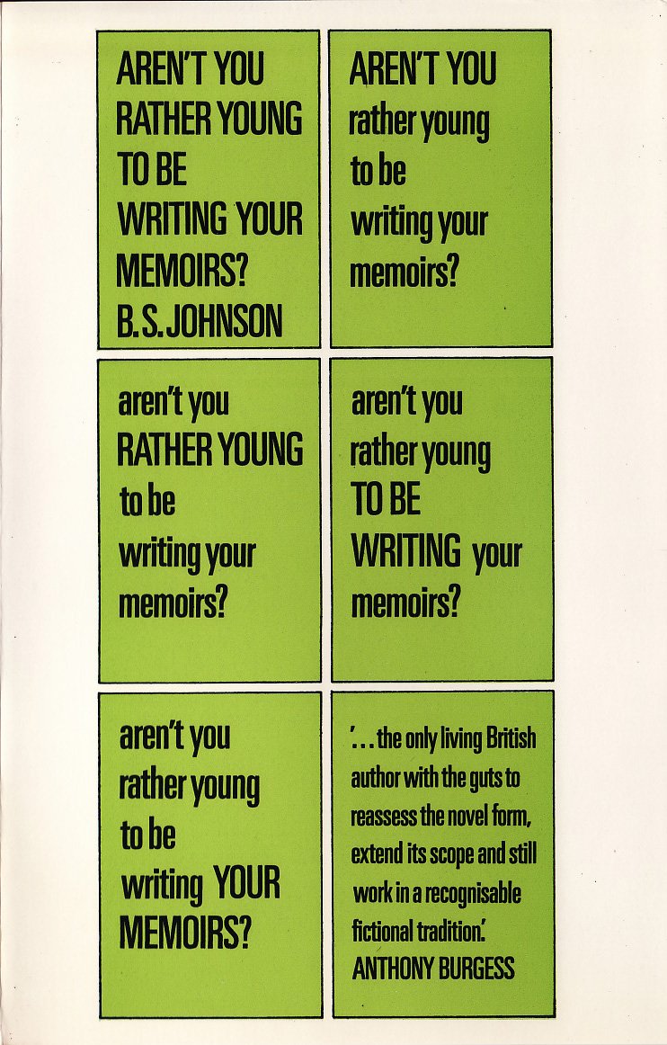 Yesterday, in a brief post-review exchange with Abegglen, Burns & Sinfield, I mentioned I had recently come across the following passage in B.S. Johnson's introduction to Aren’t You Rather Young To Be Writing Your Memoirs?: ‘I am always sceptical about writers who claim to be writing for an identifiable public. How many letters and phone calls do they receive from this public that they know it so well as to write for it. Precious few in my experience, when I have questioned them about it.’ It struck me because, as A Stubborn Fury indicates, I find it ironic that in Britain we have a largely private school and Oxbridge-educated section of society (journalists, media commentators etc.) who regularly scold contemporary theorists for using supposedly difficult language, on the grounds that it is this elite-educated section of society themselves who know best what the public can and cannot understand.
